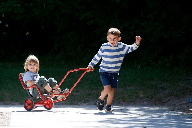 One child enjoys the ride as a passenger while the other powers the fun, pulling them along. Encourages energetic and collaborative play.