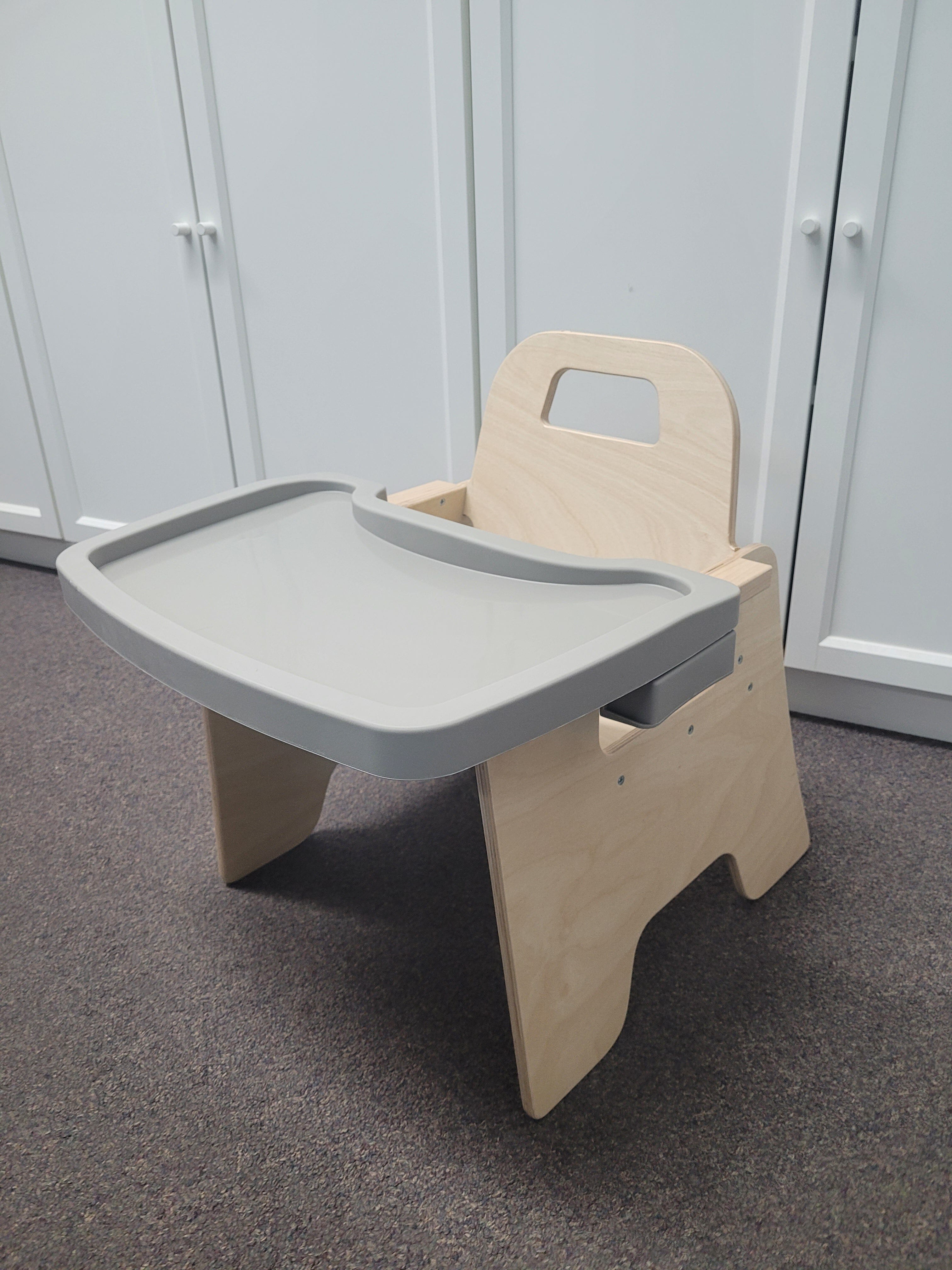 Sturdy birch chairs with ample handholds make getting in and out, carrying, and pushing effortless. Stackable for easy storage, these chairs feature high backs, wide side panels for stability, and a removable safety belt for added security. A durable, removable tray can be added for feeding or playtime.
