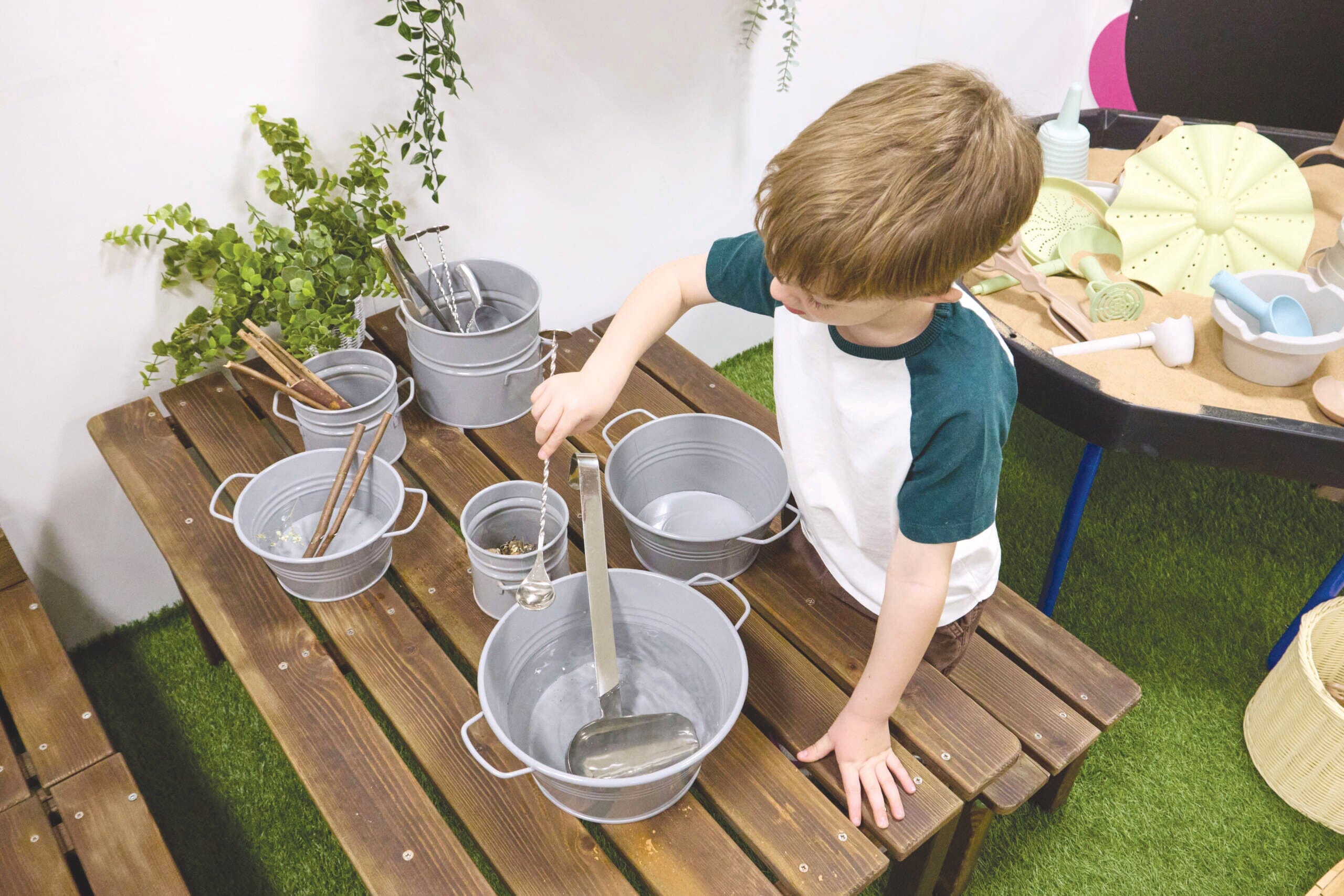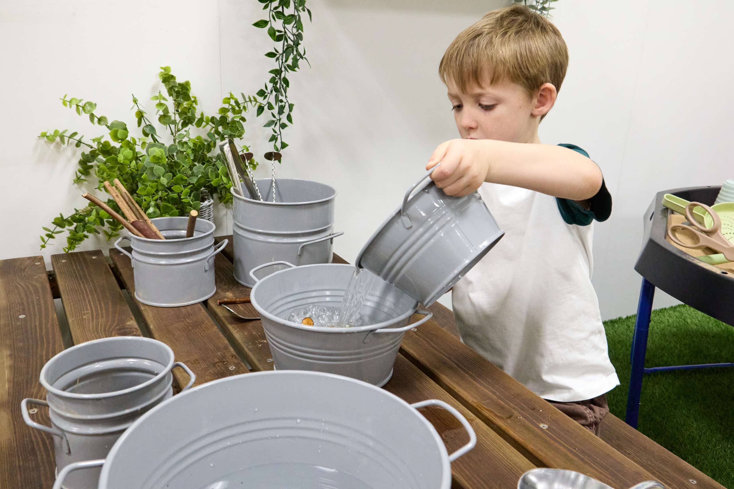 Durable metal containers for collecting, sorting, and transporting indoors and outdoors. Perfect for mud play, loose parts, and dramatic play.