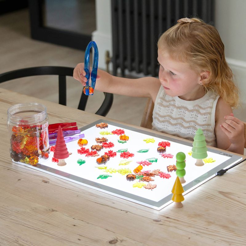 The rich autumnal tones glow beautifully on a light panel, encouraging sensory discovery and creative pattern-making.