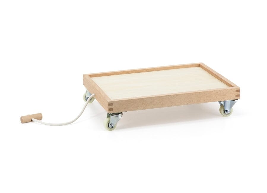 Sets of 6 beechwood trays holding building blocks of various shapes and sizes that fit together perfectly. The trays are stackable and compatible with the rolling dolly board.