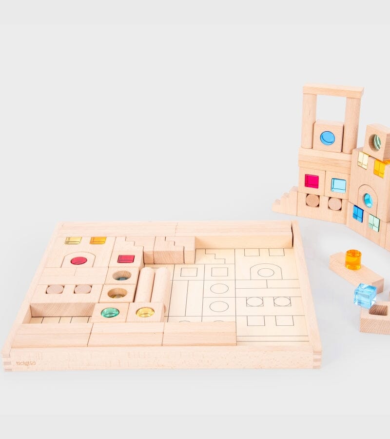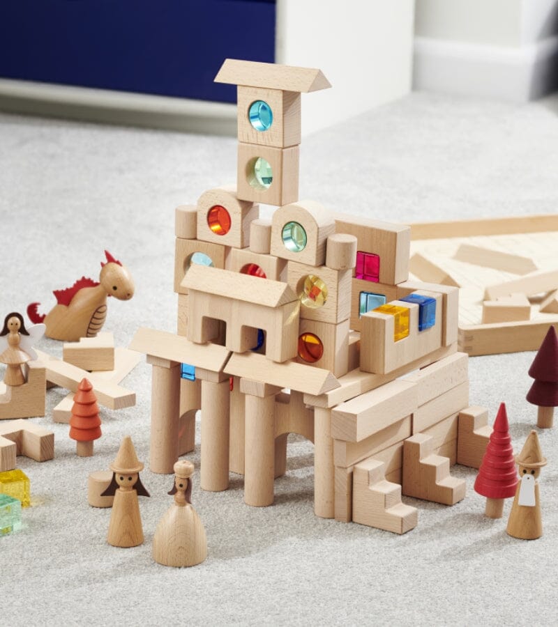 Encouraging creative construction and imaginative play, this open-ended block set features 60 beechwood blocks, 12 gem cubes, 6 gem circles, 4 kaleidoscope blocks, and a beechwood tray.