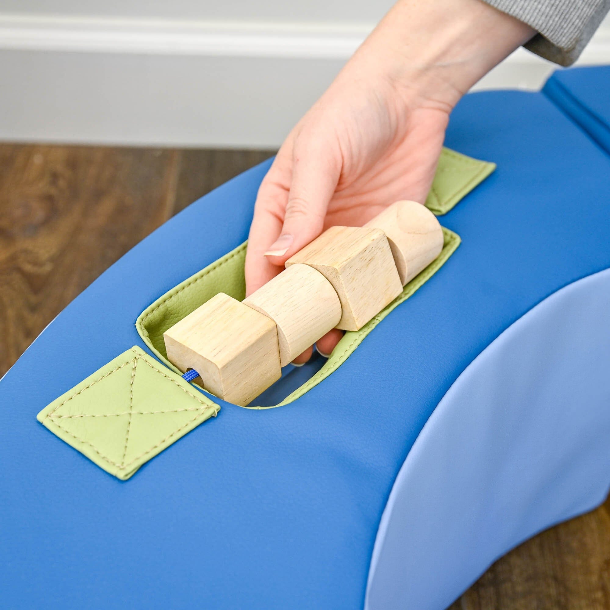 Includes wooden blocks, squeakers, bells, and pockets for engaging discovery.
